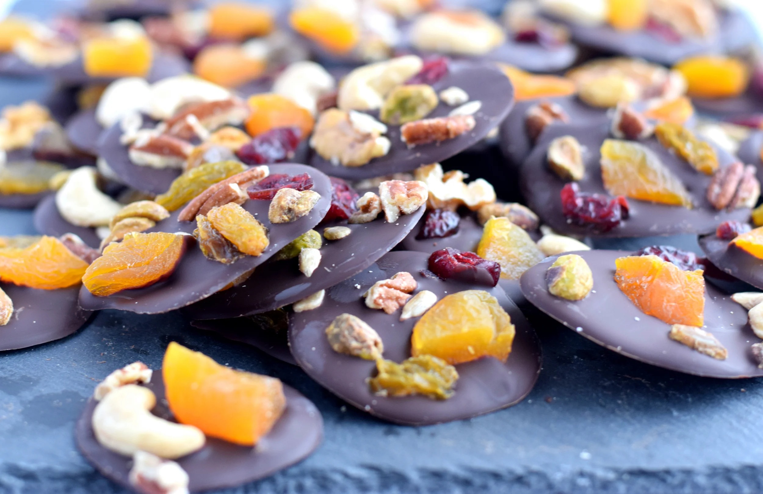 Sprinkle desired nuts and dried fruit onto each disk. Place into fridge to let harden.