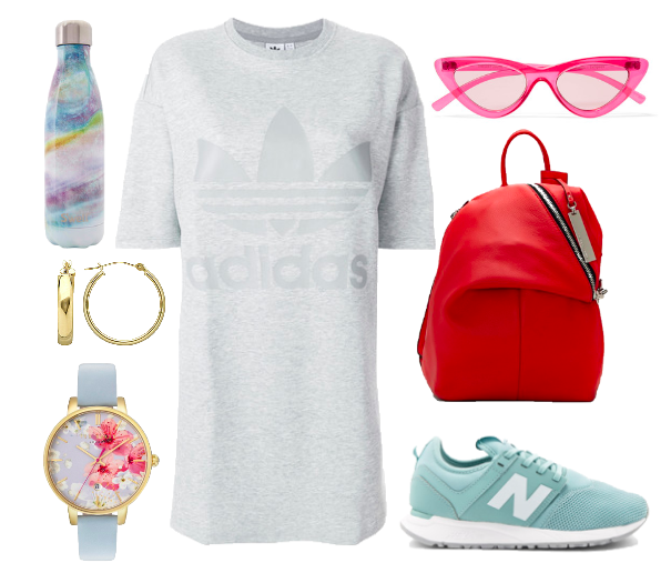The last outfit is my favorite. I love a good red and pink combo, and in our outfit here, pink cat eye sunglasses are coupled with a red backpack. New Balance kicks and some gold hoops finish off the look. This outfit is a more sporty casual, for the younger folks.