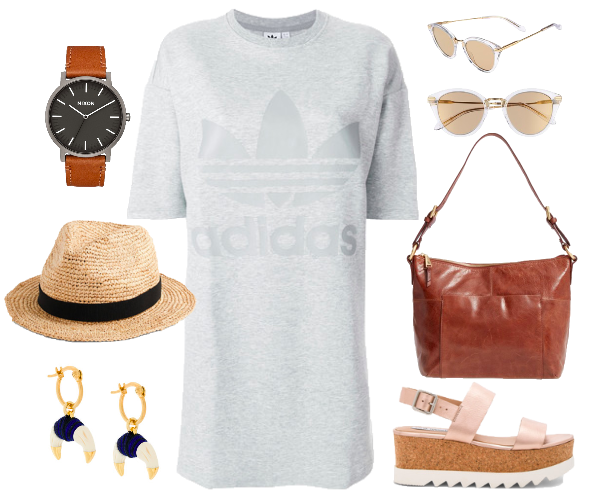 The first outfit pairs the tee dress with flatform sandals, a brown leather shoulder bag and watch, a straw hat, and some more neutral colored accessories. It's the adult version of a T-shirt dress outfit.