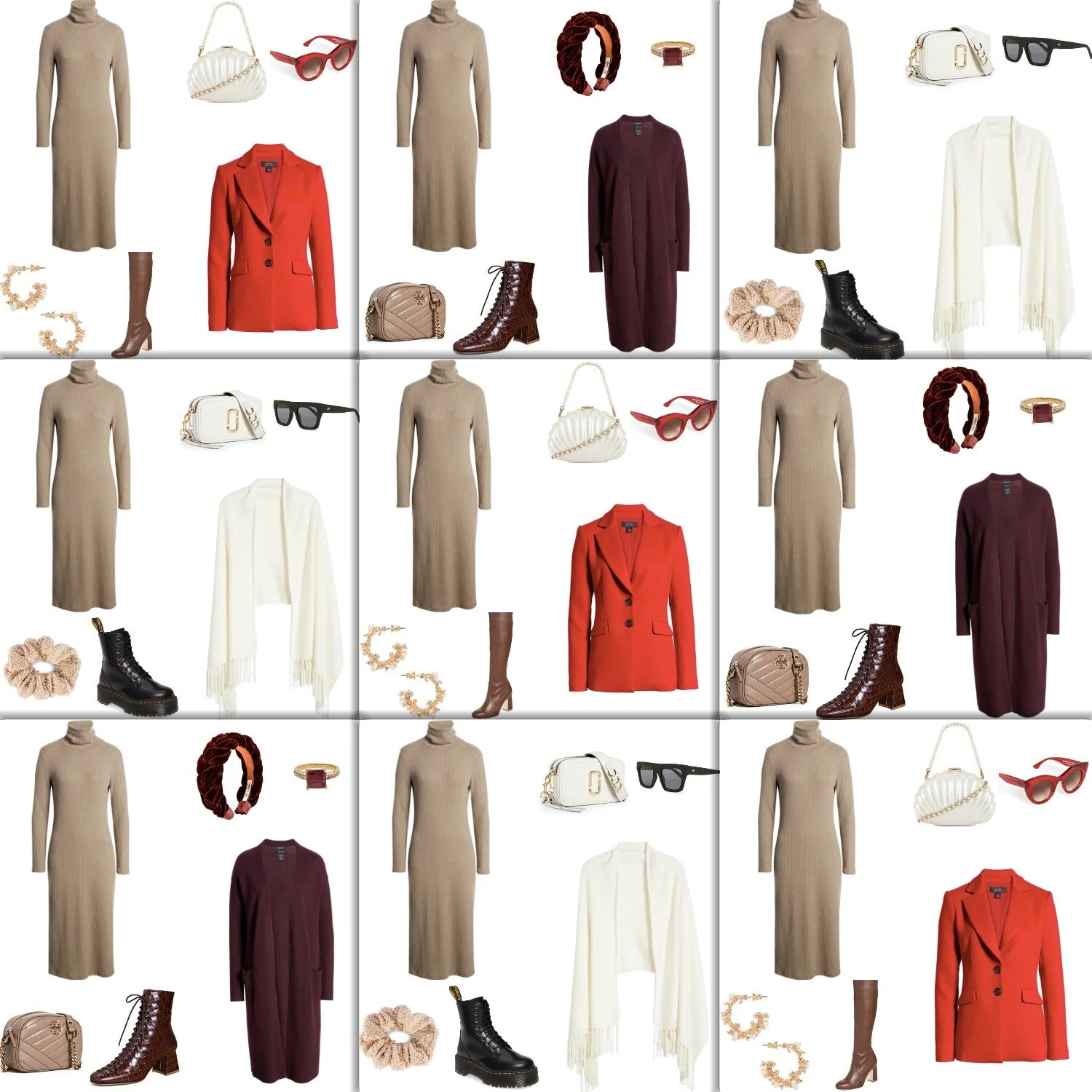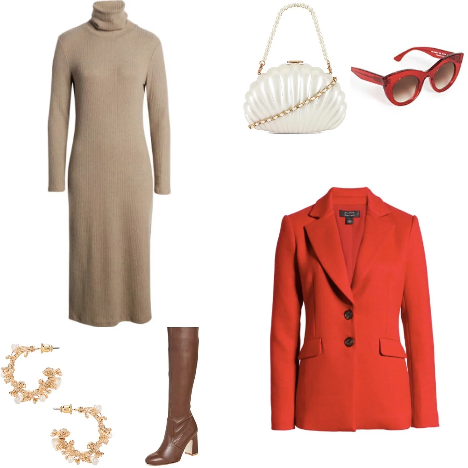 In our first outfit, the midi sweater dress is paired with knee boots, a bright blazer and sunglasses, and pearl accessories. Mature yet playful. Formal yet youthful.