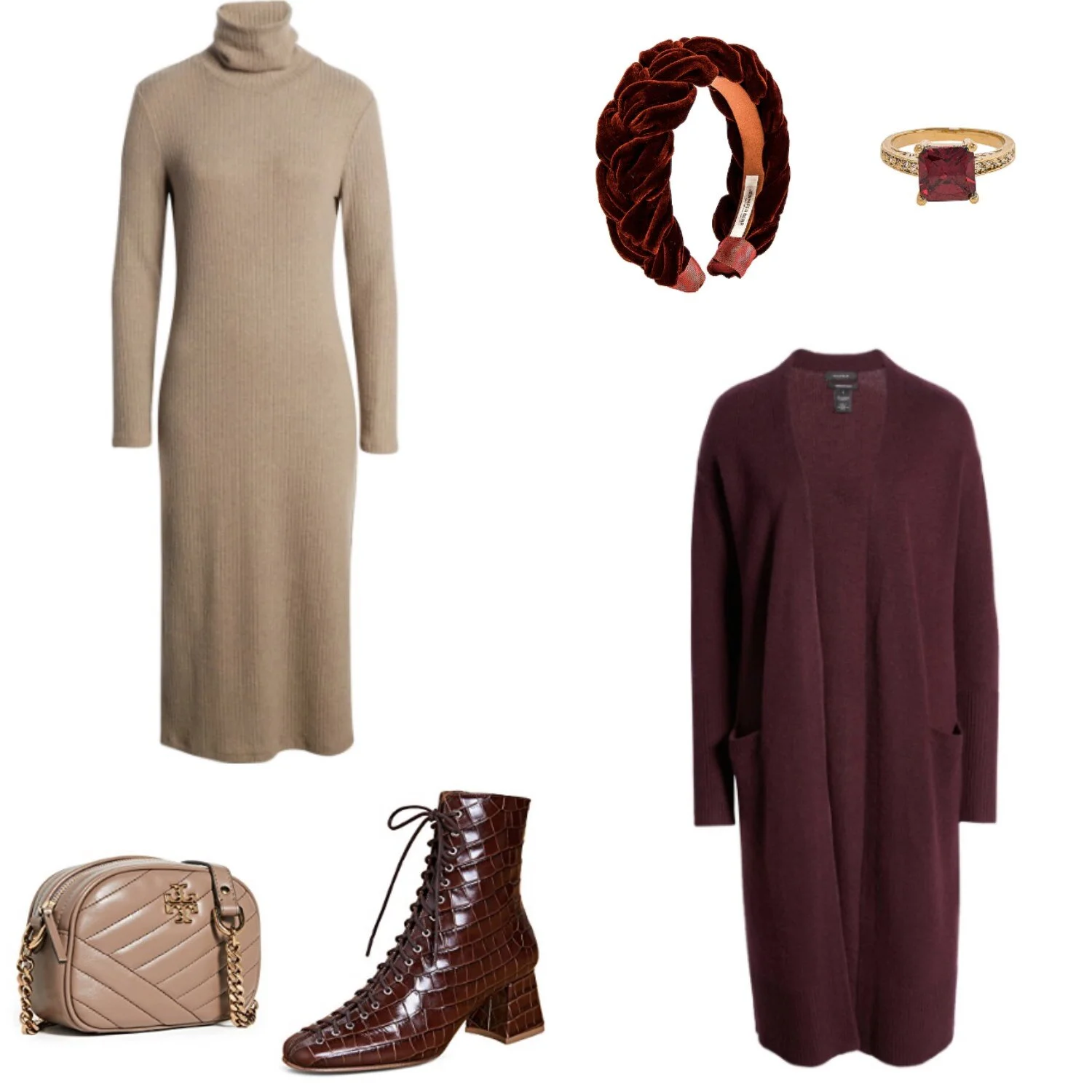 And last up, the modest midi dress is coupled with a midi cardigan. Plus adorable lace-up booties and more burgundy-toned accessories. This outfit has a very wide range of age-appropriateness. And occasion-appropriateness. It is versatile, in a word.