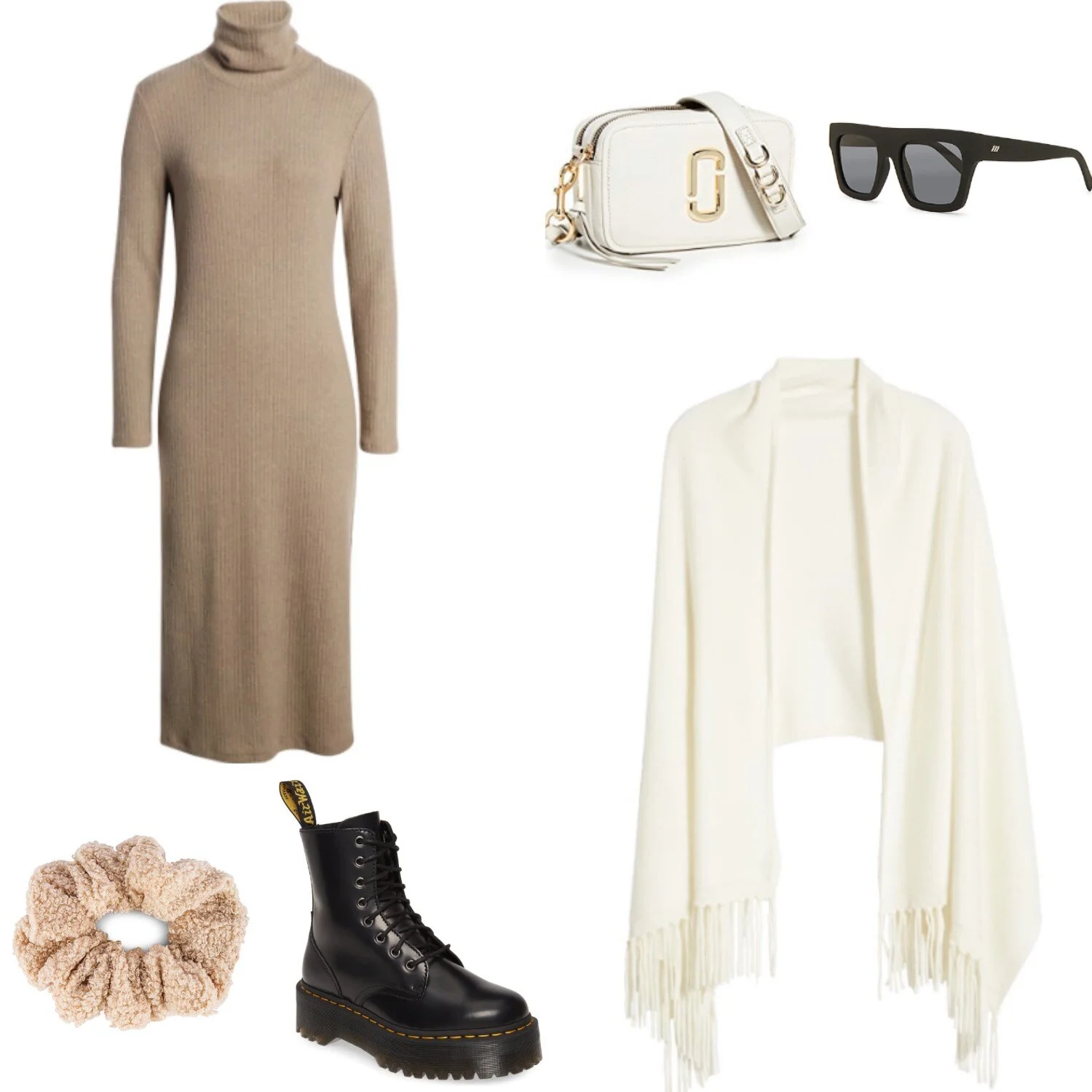 Second, we’ve got the turtleneck midi dress styled with a shawl, some platform Doc Martens (yessss), and statement accessories. Casual, cozy, chic, and my personal favorite of the three.